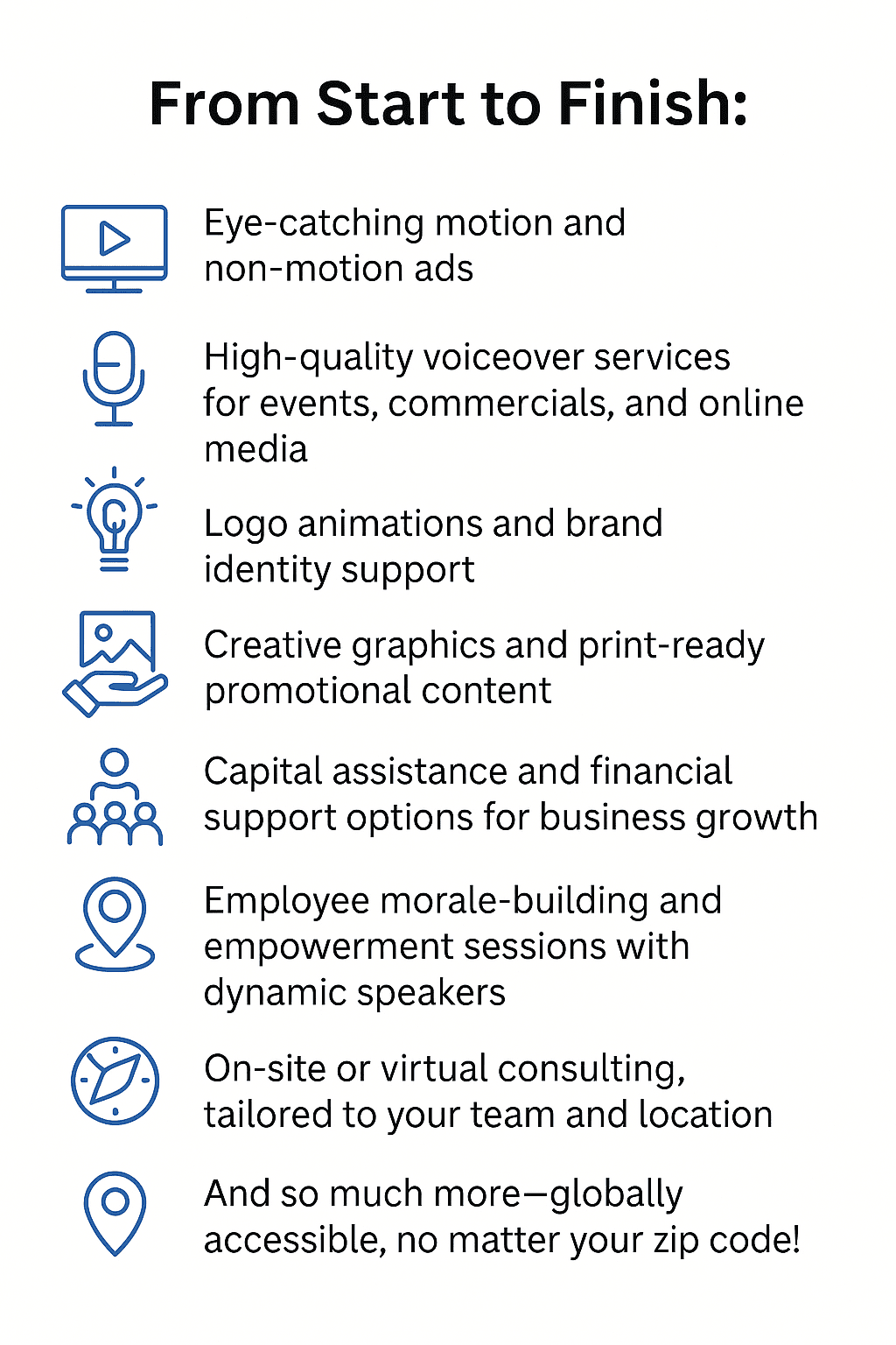 We assist each client with detailed brainstorming. We allow you time to express your ideal brand, and we provide step-by-step guidance for accomplishing each sprint(target). Our team provides eye-catching ads, both for motion and non-motion. Voice-over services are also provided for commercials of all kinds. Maybe you need one for an upcoming event, or just simply creative graphics for your logo in motion, we provide personable voices to convey your message to your intended audience. We even provide financial assistance opportunities for businesses who need capital support and growth. Along with a personal support aspect that can be provided to your employees; we have encouraging speakers for all benefits to obtain and sustain employment. We understand that the stability of all moving parts is vital for the management of progress. For morale building with established or establishing companies, we commit to on-site meetings. If you prefer the virtual approach, we are able and willing to provide that also. Our services are globally accessible through travel, so don't worry about your business zip code! A long with these basics we have so much more! Schedule a consultation TODAY!